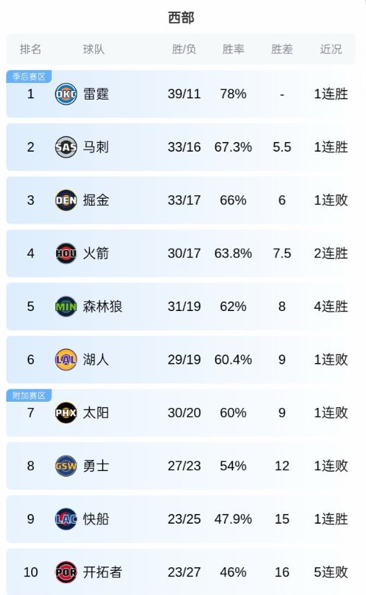 具体的西部排名:雷霆、马刺、掘金、火箭、森林狼、湖人、太阳、勇士、快船、开拓者、独行侠、灰熊、爵士、鹈鹕、国王。