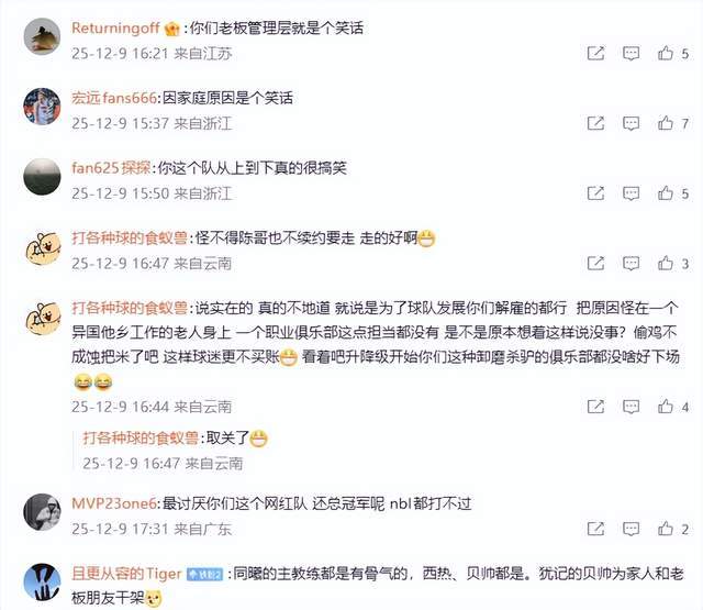 然而,球迷们对于这一说法,并不买账,纷纷留言,吵翻了天,“因家庭原因是个笑话”、“说实在的,真的不地道,就说是为了球队发展你们解雇的都行,把原因怪在一个异国他乡工作的老人身上,一个职业俱乐部这点担当都没有,是不是原本想着这样说没事?偷鸡不成蚀把米了吧,这样球迷更不买账,看着吧,升降级开始你们这种卸磨杀驴的俱乐部都没啥好下场”、“你这个队从上到下真的很搞笑”、“家庭原因,的确是同曦老板们最熟悉的理由”。