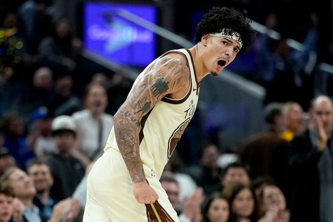 桑托斯身高2米01,臂展2米13,标准的NBA锋线身材。2022届55号秀,巴西人,没有美国大学经历,生涯前两年在勇士边缘徘徊。场均三五分,两三板,偶尔上场跑跑龙套。