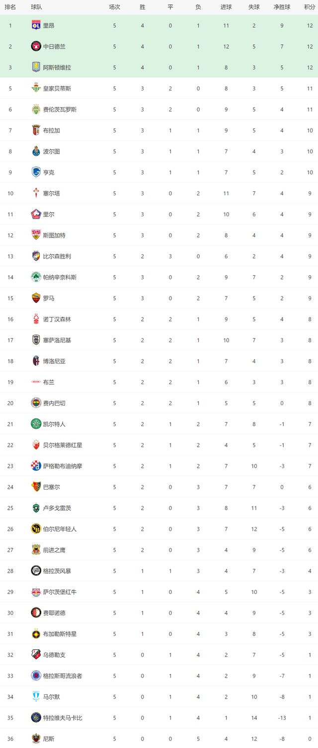 前5轮踢完,维拉4胜1负拿到12分,目前排名第三,他们和榜首的里昂,只有4个净胜球的差距。最后3轮比赛,维拉随时能反超对手,以头名的身份晋级16强。